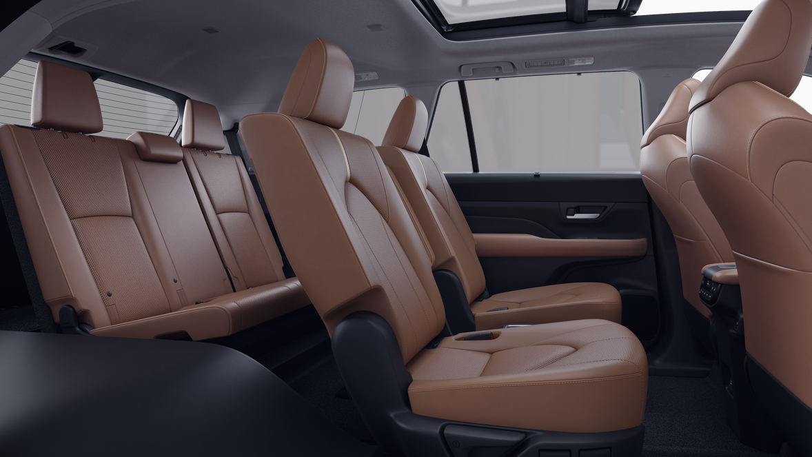 • 7-passenger seating with second-row fold-down captain's chairs and fold-down inboard armrests, adjustable headrests and two cup holders mounted on the floor; and 60/40 split, fold-down third-row seats with sliding headrests and recline function